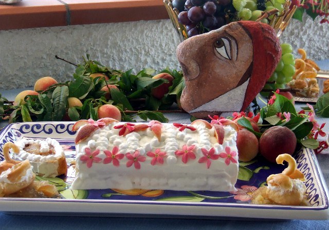Seguendo le istruzioni preparo la gelatina, misurando le pesche insieme al liquido macerato. Dopo che la farcitura è consolidata (deve stare nel frigorifero), la adagio sul rettangolo arrotolato del pan di spagna, srotolandolo delicatamente, non del tutto per non romperlo, e poi richiudendolo altrettanto delicatamente.