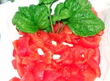 Quando l’aglio manda il suo profumo nell'aria, tuffo i filetti dei pomodori nell’olio caldo e profumato, aggiungo il basilico lavato e il sale e faccio cuocere, girando ogni tanto.