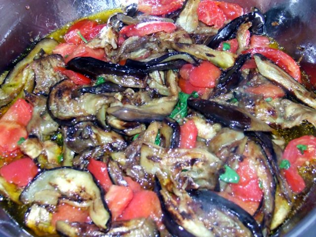Melanzane grigliate con i filetti di pomodoro in padella.