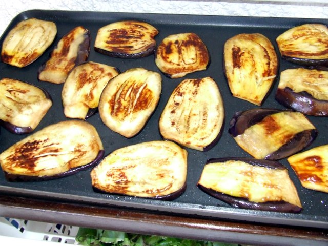 Lavo e sbuccio le melanzane (se le friggo non le sbuccio), e le taglio a fette spesse circa ½ cm, accendo la piastra al massimo, e preparo un piattino o una ciotola con un po’ di olio e vi immergo ogni fetta di melanzana da un lato solo, ma veramente appena, prima di metterla sulla piastra rovente, abbasso un po’ la temperatura e cospargo ogni fetta con qualche granello di sale. Faccio dorare e giro sul altro lato. L’olio si può stendere sulle fette delle melanzane anche con un pennello da cucina. Ripeto l’operazione fino a terminare le melanzane.