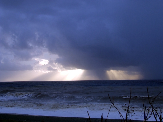 Nel frattempo avevamo finito di cenare e fuori si stavano letteralmente scatenando i quattro elementi: oltre alla pioggia diluviante, ai fulmini, seguiti da rimbombanti tuoni (quelli che fanno tremare i vetri e che qui chiamiamo “tuoni di neve”), si stava mettendo in movimento il mare e si faceva notare uno strano fischio del vento.